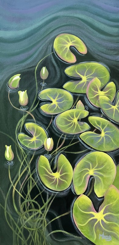 Paddling about in my kayak provides an opportunity to examine the treasures to be found in, on, and around the shorelines of many lakes in the Cariboo. Helena Lake was perfect for kayaking, not too large but a very interesting shoreline with several inlets and channels, beaver lodges, nesting loons, otter families, and a variety of water lilies. I found I was partial to these small, white lilies and their somewhat pointy leaf shapes. Leaning well over the side of the kayak gave me an interesting perspective that I found quite pleasing for a painting.