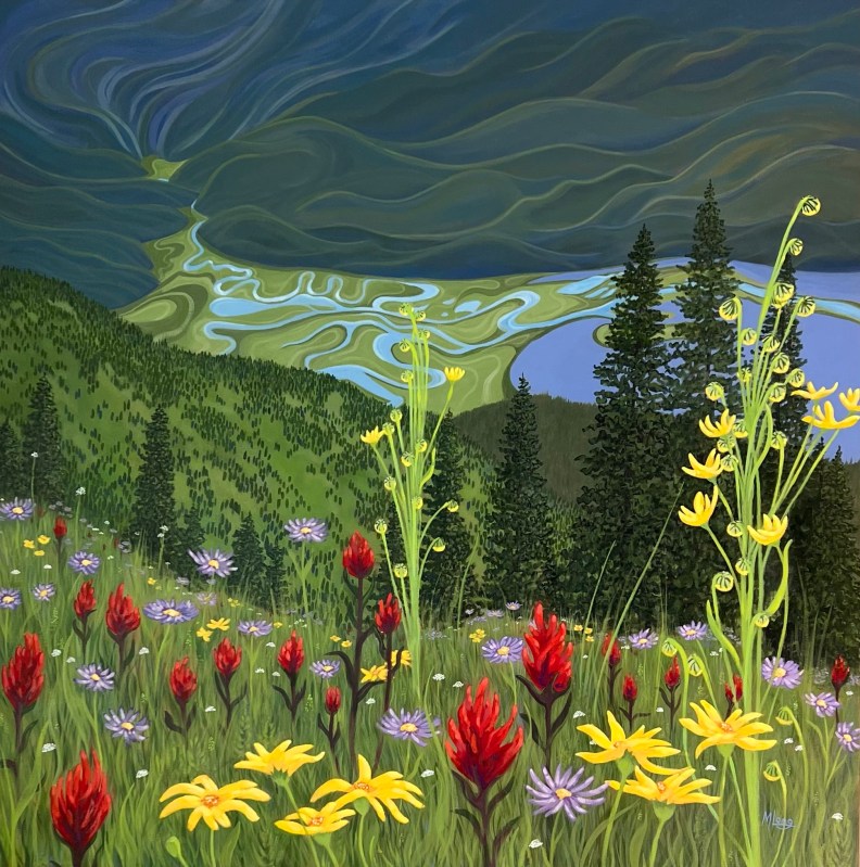 I have to say my favourite destination on a hike is an alpine meadow. In 2020 we had the pleasure of joining in on a hike to Cameron Ridge, which overlooks the Penfold Creek and Mitchell River running into the North Arm of Quesnel Lake. Even though we were hiking in the second week of August, there were still plenty of wildflowers blooming. I couldn’t resist taking several photos of the gorgeous scene before me, knowing at some point I would be painting the meandering paths of the running water as they curved and snaked their way to the lake, further enhanced with the foreground colours of the summer alpine meadow. A feast for the eyes and music for my soul.